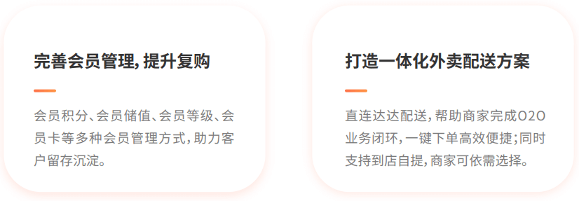 提供同城配送、到店自提、快递发货三种配送方式以及第三方达达配送,覆盖不同配送场景。支持商家自定义配送范围,提供起送配送费、阶梯配送费设置,预约定时达等功能,满足商家 多样化需求,为用户提供方便快捷的即时配送服务。